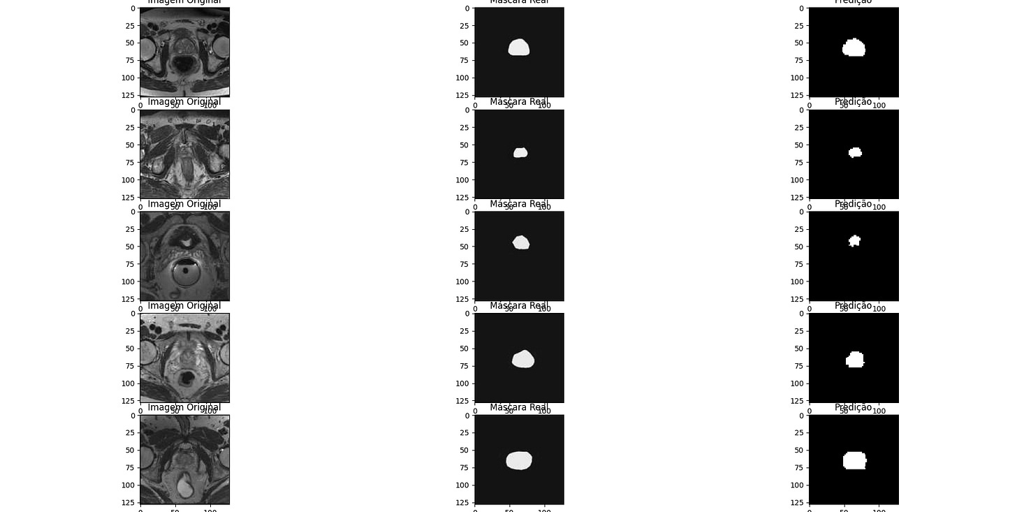 Esses exemplos demonstram que o modelo é capaz de identificar e segmentar a área da próstata com precisão razoável, embora algumas predições possam diferir ligeiramente das máscaras reais. Esse feedback visual é essencial para avaliar a qualidade do modelo e identificar possíveis melhorias.