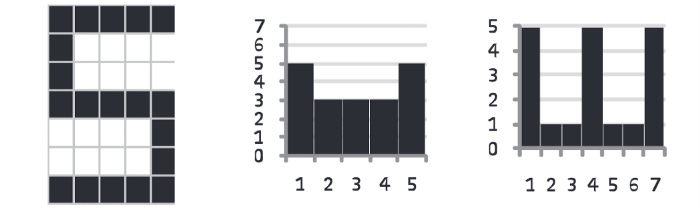 We can use projections to extract features onto an image, for example, if we want to recognize some characters. The projection histogram is the method that uses the image projection in a established direction, for example, in a vertical or horizontal direction. These projections mean a number of pixels belonging to objects in each column or each row, and it is a good idea because we can represent an image by reducing the number of descriptive information. The image below represents the number 5 and the vertical and horizontal projections respectively.