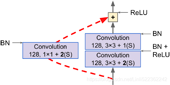 Note that the number of feature maps is doubled every few residual units, at the same time as their height and width are halved, using a convolutional layer with stride 2. When this happens, the inputs cannot be added directly to the outputs of the residual unit because they don’t have the same shape, for example, the problem affects the skip connection represented by the dashed arrow in the lat figure. To solve this problem, the inputs are passed through a 1x1 convolutional layer with stride 2 and the right number of output feature maps.