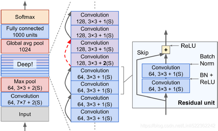The architecture of RenNet is simple. It begins and ends similarly to GoogleNet, but without a dropout layer, and in between is just a very deep stack of simple residual units. Each residual unit consists of two convolutional layers without a pooling layer, with batch normalization and ReLU activation, using 3x3 kernels while preserving spatial dimensions.