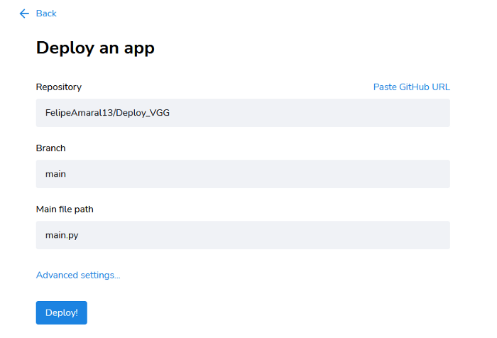 Type in the repository path and the name of the Streamlit app file and click Deploy (the Branch stays as ‘main’).